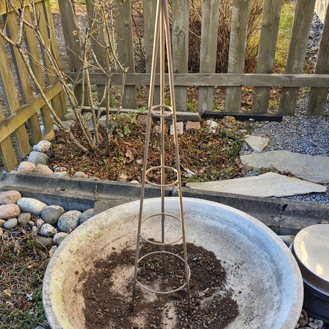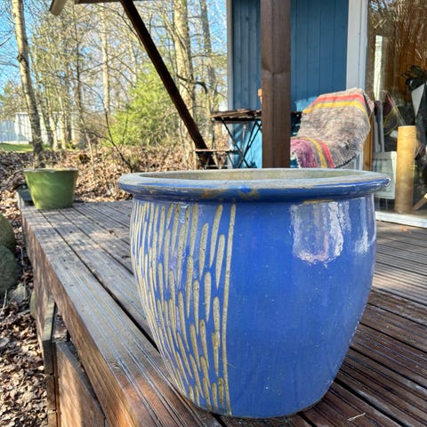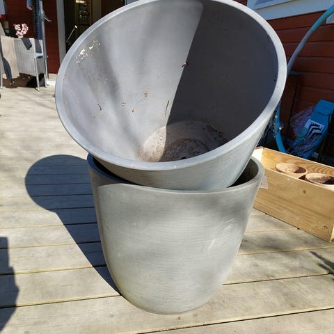 Kaksi betonista/sementistä tehtyä rouhea ”brutalistista” ruukkua/ruukunsuojusta. Huokoinen pinta. Ei reikää pohjassa. Raskaat, pysyvät hyvin pystyssä tuulessakin.