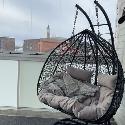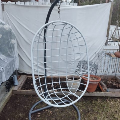 Riippuva tuolikeinu, jossa metallirunko ja punottu kori. Tuolissa on harmaa istuinpehmuste. Sopii esimerkiksi parvekkeelle tai terassille rentoutumiseen ja oleskeluun. Keinu on munanmuotoinen ja se on kiinnitetty jalustaan, joten sitä ei tarvitse ripustaa kattoon.