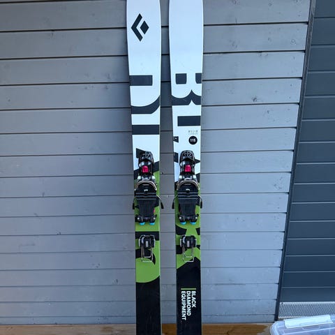 Linken sukset integroiduilla siteillä. Suksissa on harmaa pohja ja valko–vihreä yläpuoli. Siteet ovat säädettävät ja niissä on harmaa runko sekä vihreät yksityiskohdat.
