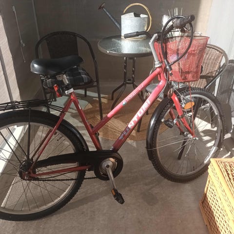 Siisti polkupyörä, jossa runko, pinnat ja vaihteet kunnossa. Renkaissa pysyy ilma, mutta ovat vähän haurastuneet.