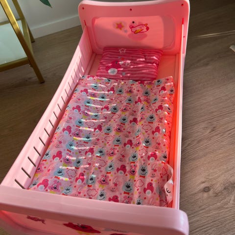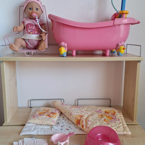 Baby Born nuken tarvikesetti, johon kuuluu vaaleanpunainen kehto pyörillä ja verholla, kantoreppu, potta, kypärä ja vaatteita. Kaupan päälle sitteri ja vaatteita muilta merkeiltä.
