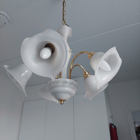 Myydään valkoinen kattovalaisin hyvässä kunnossa. Valkoisessa kankaassa on muutamia pieniä jälkiä, jotka näkyvät lähinnä tarkasti katsottaessa, lähtevät todennäköisesti pesemällä.
