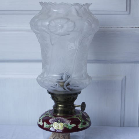 Öljylamppu, jossa valkoinen lasikupu ja kirkas lasisavuputki. Lampussa on koristeellinen messinkijalka ja poltinosa. Kuvista näkyy lampun rakenne osineen: jalka, poltin, lasisavuputki ja irrotettava lasikupu.