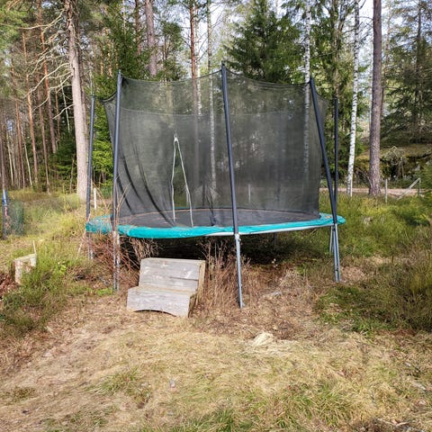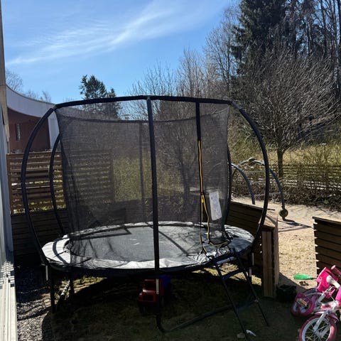 Myydään keväällä 2022 ostettu trampoliini, joka on ollut meillä valmistajan mukaisessa ympärivuotisessa käytössä lumia välillä luoden. Kunto oikein siisti, on pesty säännöllisesti, viimeksi nyt keväällä. Vain jäkäläkasvua tarranauhoisssa. Matossa on ollut parin vuoden ajan pieni reikä, joka ei ole kasvanut temppukäytössä. Vetoketju ja verkko ehjät.