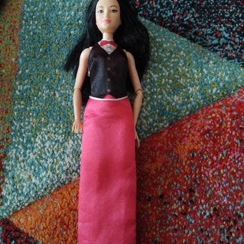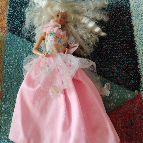 Barbie nukke, jolla on vaaleat hiukset ja siniset silmät. Nukella on vaaleanpunainen mekko, jossa on vaalea yläosa ja läpikuultava helma. Nuken pituus on noin 29 cm, eli perinteinen Barbie-koko. Sopii leikkeihin tai kokoelmaan. Huomioitavaa, että mekon yläosan kangas ja koristeet näyttävät kuluneilta ja osittain revenneiltä, mikä näkyy kuvissa.