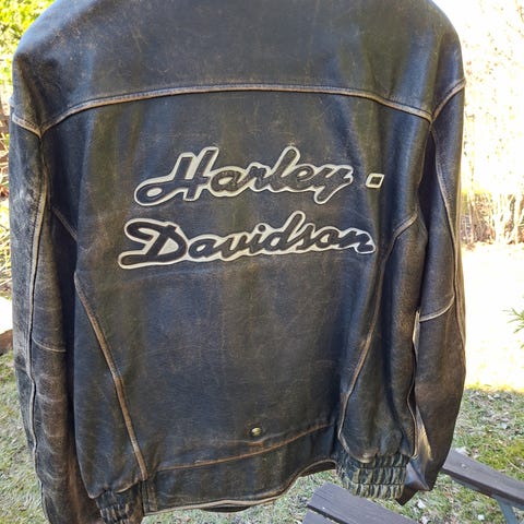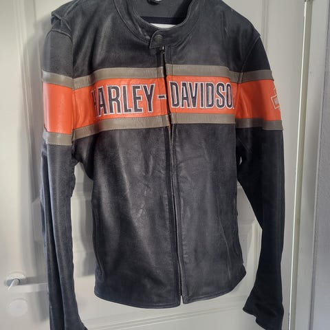 Harley-Davidson nahkatakki. Musta aito nahka, oranssit raidat hihoissa ja selässä sekä suuret Harley-Davidson -logotekstit edessä ja takana. Vetoketjukiinnitys edessä ja vetoketjulliset sivutaskut. Vuori polyesteriä. Hoito-ohjeen mukaan vain ammattilaisen tekemä nahkapuhdistus, ei vesipesua eikä kemiallista pesua. Sopii moottoripyöräilyyn ja arkikäyttöön.