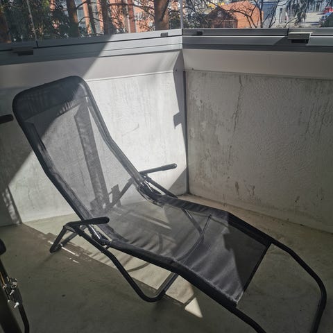 Musta aurinkotuoli ulkokäyttöön. Tuolissa on metallirunko, tekstiilipäällyste sekä niskatyyny. Sopii terassille, parvekkeelle tai pihalle.