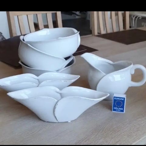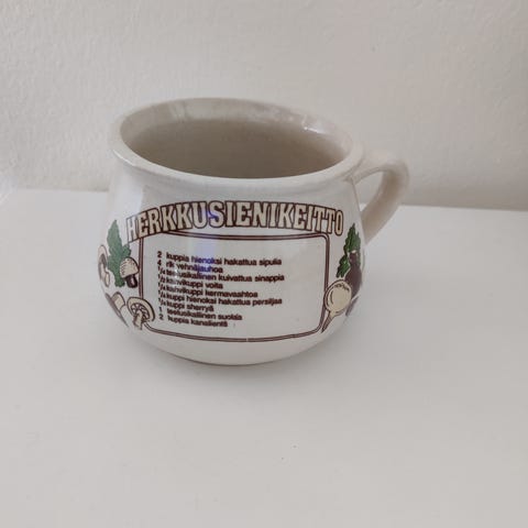 Keittokulhot kahvoilla, valkoista keramiikkaa. Kulhoissa on painatuksena eri keittotekstit ja kuvitus ulkopinnalla. Kullakin kulholla on kaksi vastakkaista korvaa, jotka helpottavat käsittelyä. Sopivat esimerkiksi keittojen tai muiden lämpimien ruokien tarjoiluun. Tai kahvikupeiksi. Myydään kolmen kulhon settinä kuvien mukaisesti.