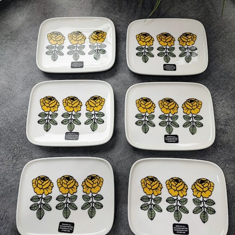 Myynnissä vain koristeena olleet Marimekon keltaiset Vihkiruusu-kulhot (2,5dl) ja keltaiset Lokki-servietit (25 x 25cm) yhteishintaan kaikki 42e. Katsothan muutkin ilmoitukseni :)