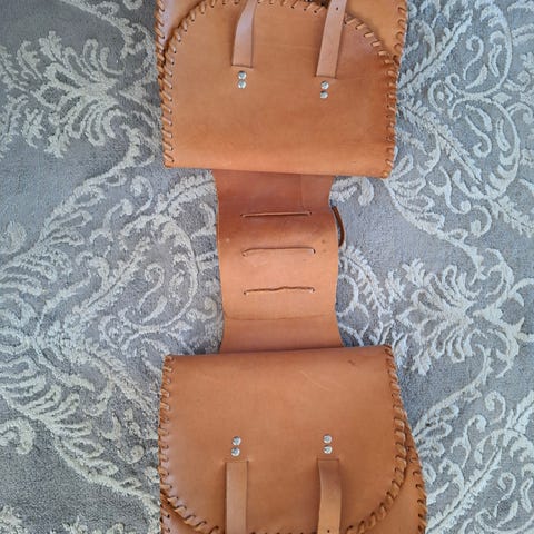 kestää sadetta ja tuiskua hyvin ravattuna. Koko n.22*54 ja korkeus n.29cm, joten näihin mahtuukin jo jotain. Ehjät, mutta elämää nähneet nahkaiset sivulaukut