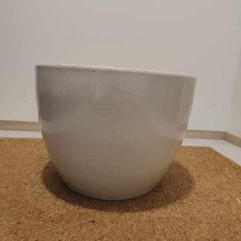 Keraaminen suojaruukku. Halkaisija 18cm, korkeus 15cm. Kuvassa näkyvä jälki oli jo ostettaessa.