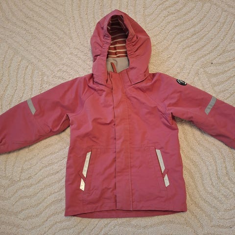 Kevytuntuvatakin takahelmassa ilmeisesti pihkaa tms mistä tullut jälki. Helmassa myös pieni reikä. Kuoritakki pesty kerran. Ei ehkä priima enää mutta ihan käyttismatskua
