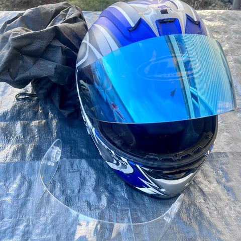 Kypärä hyvässä kunnossa, ei naarmuja/kolhuja. Visiirissä kulumaa.