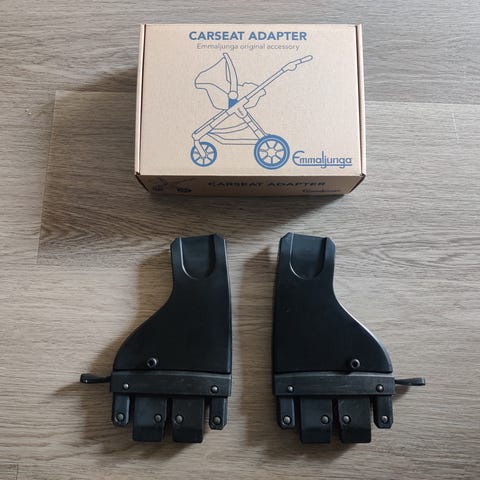 Emmaljunga Maxi Cosi standard -adapterit vaunuihin. Mustat muoviset adapterit, joilla voidaan kiinnittää Maxi Cosi -turvakaukalo yhteensopiviin Emmaljunga-rattaisiin. Pakettiin kuuluu kaksi adapteriosaa.