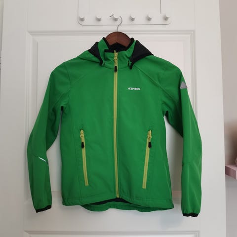 Myydään siistikuntoinen softshelltakki 140 cm Icepeakilta. Musta, siniset ja keltaiset yksityiskohdat.