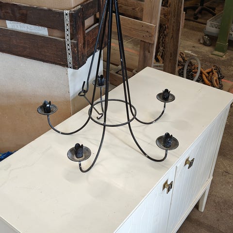 Metallinen kattokruunu, jossa koristeelliset lehtiaiheet ja ruusumaiset yksityiskohdat. Kruunussa on kolme kynttilän paikkaa ja riippuvia koristekristalleja (muovia). Sopii sisäkäyttöön. Väri vaalea, hieman patinoitu metalli.