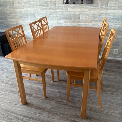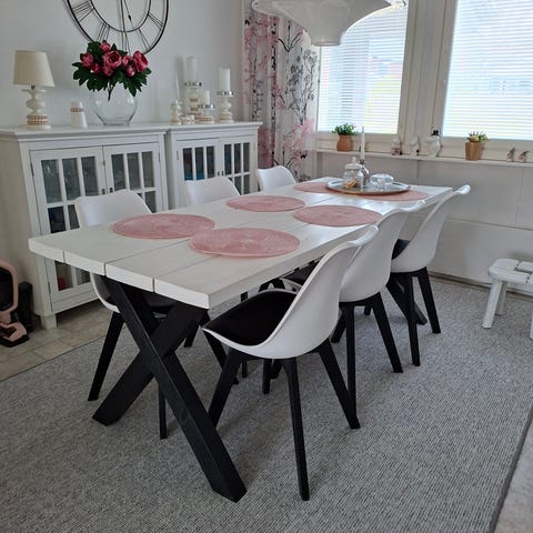 Maskusta ostettu hieno ruokaryhmä, 6 päällystettyä tuolia metalli jaloilla ja lankkupöytä. Pöytä maalattu tummanharmaalla, hileisellä maalilla. Painaa kun syntinen. Pituus 200cm, leveys 94,5cm ja korkeus 74cm