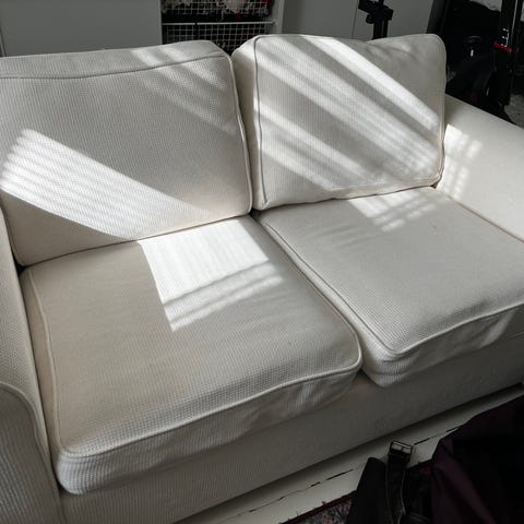 2 istuttava sohva. Sohva on vaalenpunaisen beige. Päälliset ovat pestävät. Rahi on valkoinen ja sen kannen alla on säilytystilaa. Voi ostaa vain toisen jos haluaa.