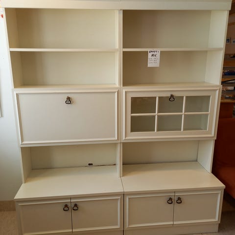 Jyskin hyväkuntoinen, harmaavalkoinen Ullits-hylly. Alaosassa vetolaatikko, jonne mahtuu reilusti tavaraa.