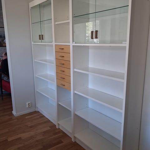 Tukeva ruskean sävyinen hyllykkö kolmella irrotettavalla lasihyllyllä. Lasit jotain mattapintaisia hiottua lasia. Hyllykön voi laittaa vaikka matalan tasohyllyn päälle yhtenä osana hyllyä. Ostettu aikoinaan Vepsäläiseltä. Kuljetus mahdollinen Oulun lähialueelle
