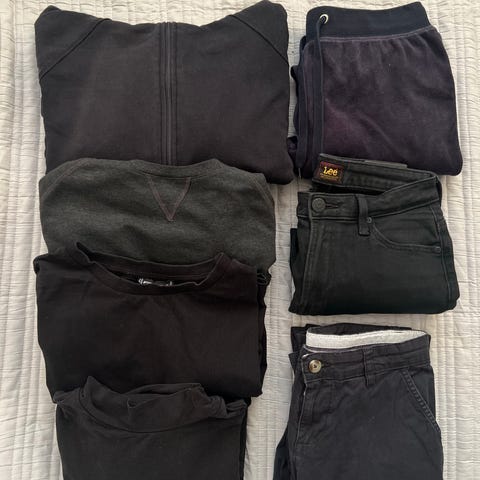 Kolme H&M paitaa (värit musta, t.sin. ja harmaa) sekä yksi Puman paita (vihreä).