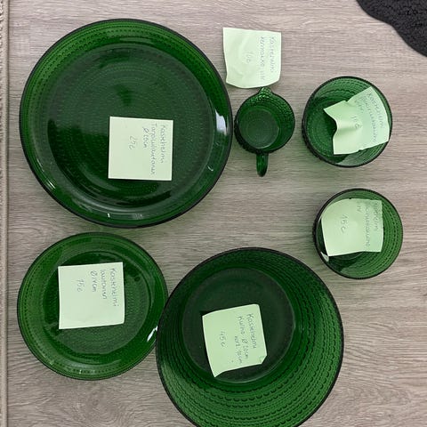 Kauniit kirkkaanvihreät kastehelmi astiat lautaset 4 kpl läpimitta 17 cm, pikkukipot 10,5 cm.