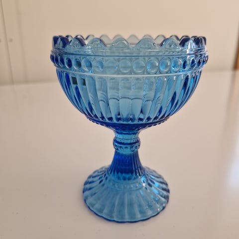Tummansininen mariskooli, koko 155 mm. Jalallinen malli tuo korkeutta kattaukseen ja toimii myös yksittäisenä sisustusesineenä. Värin oikeasta nimestä en ole varma.