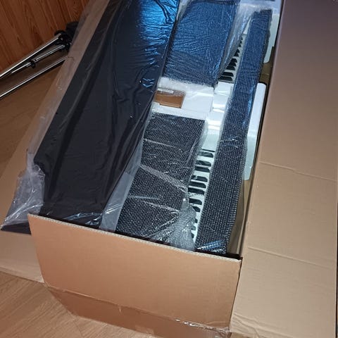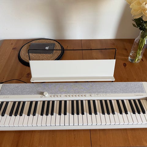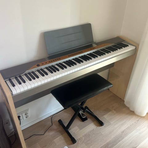 Vähän käytetty. Hintaan kuuluu jalusta, tuoli ja musiikkilepo.