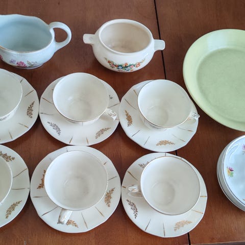 Arabia kahviastiasto kukkakoristeinen. Valkoisessa posliinissa on kukkakuviointi ja kullanvärinen reunus. Kokonaisuuteen kuuluu useita kahvikuppeja, tasseja ja lautasia sekä tarjoiluastioita. Soveltuu kahvi- ja teehetkiin sekä kattaukseen useammalle henkilölle. yht45.-