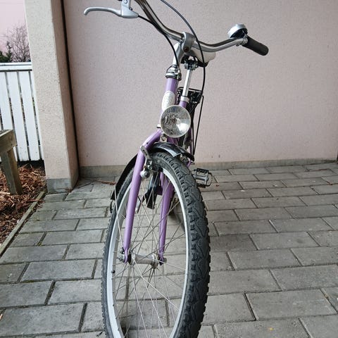 lastenpyörä 24". Pyörässä on 24 tuuman renkaat ja matala runko, joka helpottaa kyytiin nousemista. Väriltään pyörä on pinkki. Varusteluun kuuluu etuvalo, lokasuojat, tavarateline takana sekä ketjusuoja. Soveltuu lapselle, jolle 24 tuuman rengaskoko on sopiva.