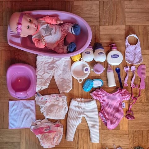 Kokonaisuuteen kuuluu nukke ja kuvissa näkyvät tarvikkeet: astiat, ruoka, tutti ja tuttipullo, hiusharja, potta, vaippa, suihkusieni, vuodevaattet, lasten pyörään kiinnitettävä nuken turvaistuin ja alkuperäinen Baby Born -kylpyamme (vanha malli).