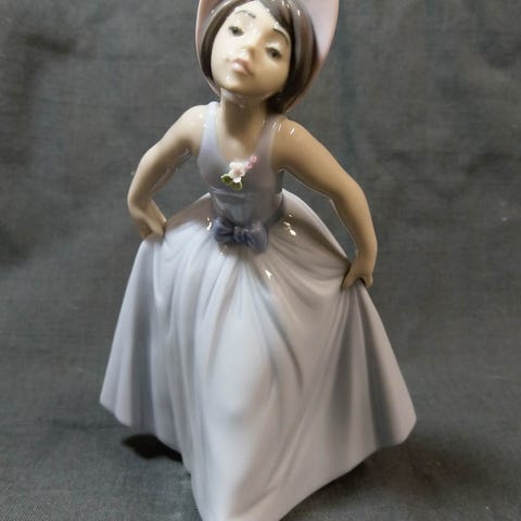 Nadal posliinifiguuri, jossa seisova tyttö pitelee käsissään kukkakoria. Figuuri on vaaleasävyinen, tytöllä on vaalea paita, siniharmaa hame ja esiliina. Mukana alkuperäinen Nadal-laatikko. Sopii koriste-esineeksi esimerkiksi hyllylle, vitriiniin tai keräilykokoelmaan.