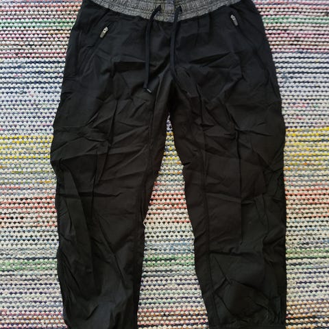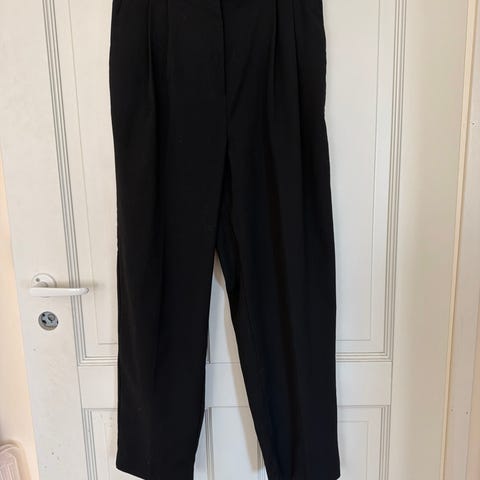 H&M housut naisille, koko 36. Väri musta ja materiaali polyesteri viskoosisekoite. Housuissa on vyötäröllä hakaskiinnitys ja nappi sekä etutaskut. Malli sopii arki- ja toimistokäyttöön.