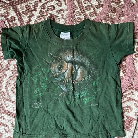 Name it t-paita, koko 104. Keltainen-harmaa raidallinen kuosi ja edessä eläinhahmokuvio. Takana erilaisia tassunjälkikuvioita. Materiaali puuvillaa. Kauttaaltaan vähän nukkaantunut. Ehjä ja siisti.