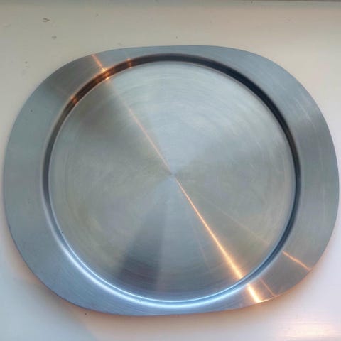 Iittala Kivi teräslautanen / tarjotin kynttilätuikuille. Suunnittelija Heikki Orvola. Teräslautasessa kuvan mukaisia jälkiä.