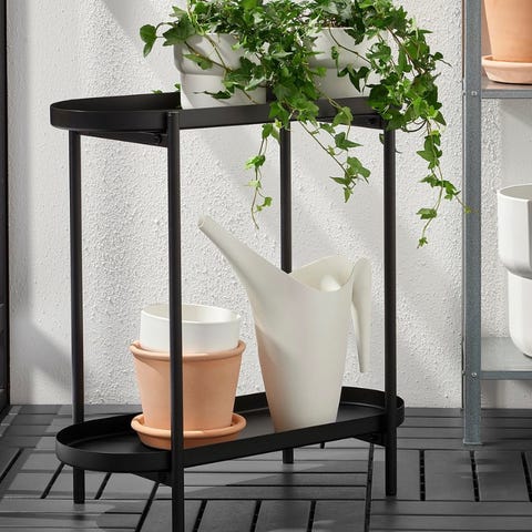 Metallinen musta kaksitasoinen pikku taso. Korkeus 56cm leveys 54cmx22cm
