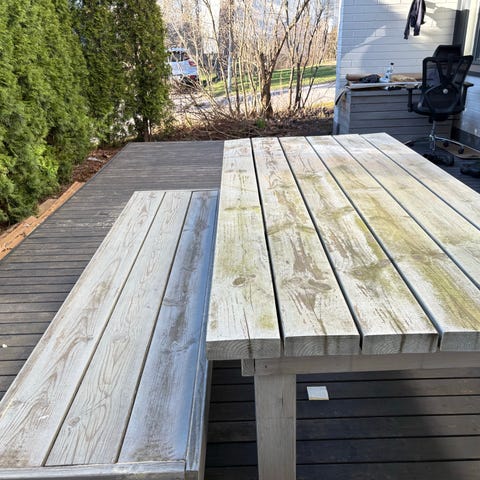 Myydään lasten kokoinen pöytä-penkkisetti. Runko metallia, puuosat kestopuuta. Todella tukeva. Rungossa ruostetta paikoin.