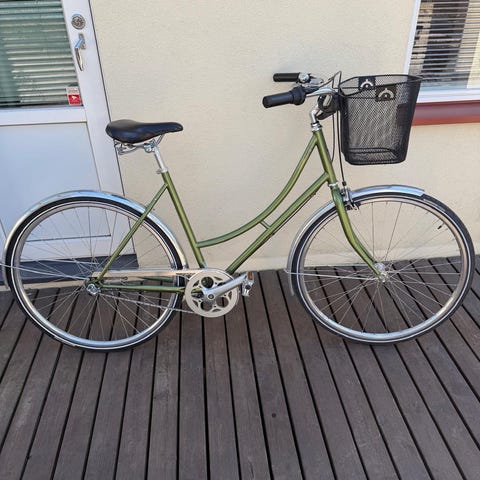 Hyväkuntoinen naisten kaupunkipyörä. Ostettu 2021, ajettu lähinnä 1-3km matkaa kauppaan silloin tällöin. Säilytetty kesällä vajassa, talvella autotallissa, todella siistissä kunnossa.
