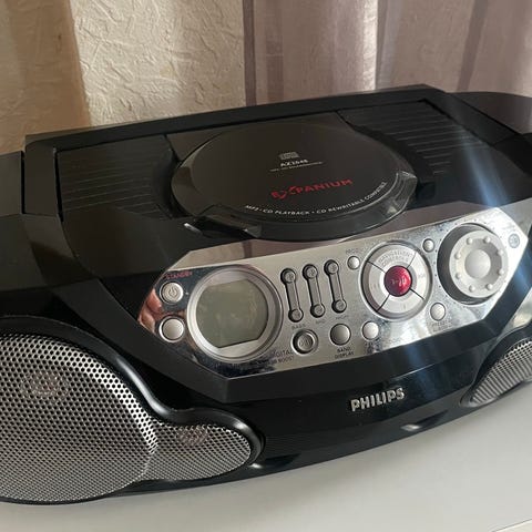 Philips kannettava CD-soitin ja radio. Laitteessa on sisäänrakennettu CD-soitin, FM/AM-radio teleskooppiantennilla sekä etupuolella kaksi kaiutinta. Virtalähteenä voidaan käyttää verkkovirtaa tai paristoja, jotka sijoitetaan laitteen pohjaan. Väritys on mustavalkoinen ja laite soveltuu esimerkiksi kotiin tai mökille perusmusiikin ja radiokanavien kuunteluun. Tässä tekoälyn kuvaus!