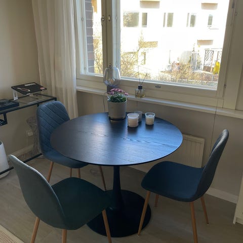 Myydään siistikuntoinen ruokapöytä + 4 kpl tuoleja. Pöydän päällä on lasinen pintalevy, joka on irroitettavissa. Tuolit ovat materiaaliltaan valkoista keinonahkaa, joka on helppo pitää puhtaana. Suurempia käytönjälkiä ei ole. Pöydän lasituksessa on jokunen pieni naarmu, jonka huomaa vain hyvin läheltä katsomalla.