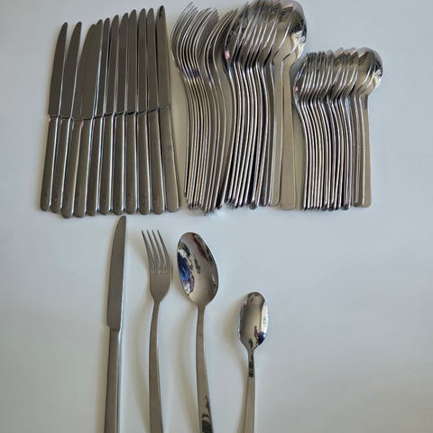 Juhlien kahvikattaukseen tai vaikka ihan arkiseen käyttöönkin kaksi Villeroy & Bochin Louis settiä joissa kummassakin kuusi kahvilusikkaa, kuusi leivoshaarukkaa, lakkulapio ja salaattiottimet. Myydään myös erikseen, hinta 45 euroa / setti.