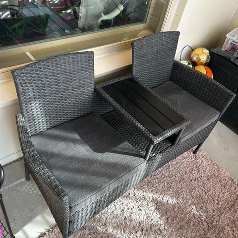 Parvekekalusteet - musta sohva ja beige tuoli