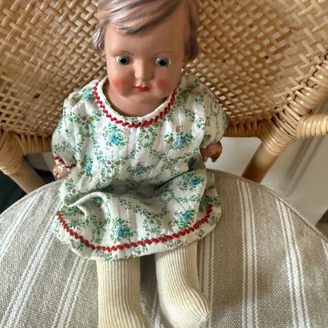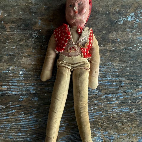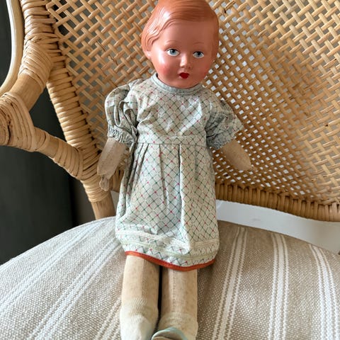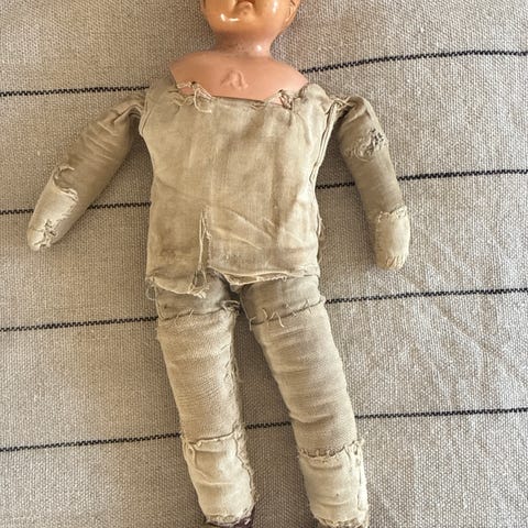 Myydään kuvan ihastuttava, vanha nukke. Pää komposiittia ja vartalo kankainen. Kulumaa on ja toinen käsi korjattu/ tehty uusi jälkikäteen. Pituus 43cm. Miel.nouto.