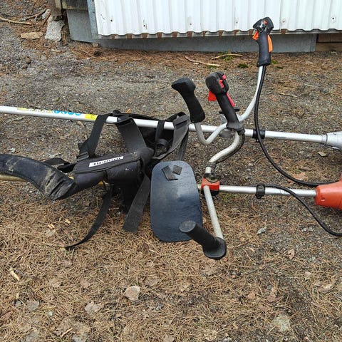 Kuvan trimmerit kaikki yhteensä 50e./tarjoa!!!. Vaativat huoltoa/korjausta. Olleet pari vuotta kuivassa varastossa/käyttämättä. Koneet ei ole jumissa. Oleo macista puuttuu siimapäästä jousi josta johtuen siiman syöttö ei toimi. Moottorikatteen kiinnike rikki. Kiinni sinisellä sähkölangalla.
