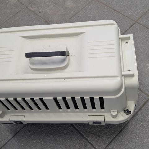 Muovinen lemmikkikuljetuslaatikko, väri harmaa/tummansininen. Metallinen etuovi, jossa lukitusmekanismi. Ilma-aukot sivuilla ja takana ilmanvaihtoa varten. Yläosassa kantokahva helpottamaan siirtämistä. Sopii esimerkiksi kissan tai pienen koiran kuljettamiseen autossa tai muissa kulkuvälineissä valmistajan kokosuositusten mukaan.
