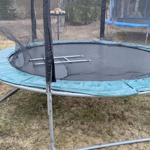 3.7m trampoliini, 81 jousta. Jouset ja hyppymatto hyvässä kunnossa, muutama ylimääräinen jousi mukaan. Reunapehmusteet ja verkko kaipaa uusimista.