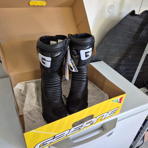 Mustat gore-tex moottoripyöräsaappaat (gaerne midland) koko 46. Korkea varsi ja vahvistettu rakenne tarjoavat suojaa ajossa. Saappaissa on säädettävät solkikiinnitykset ja muotoiltu nilkkaosa. Pohjassa on karkea kuviointi. Soveltuvat moottoripyöräilyyn ja muuhun ajovarustekäyttöön. Käyttö ollut vähäistä, käymätön koko.