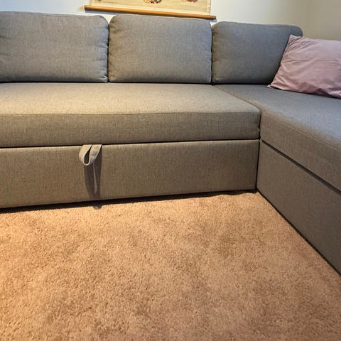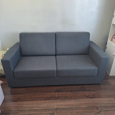 Kuvan mukainen sohva. Istuinsyvyys 57 cm. Nukkumisleveys 120 cm.
