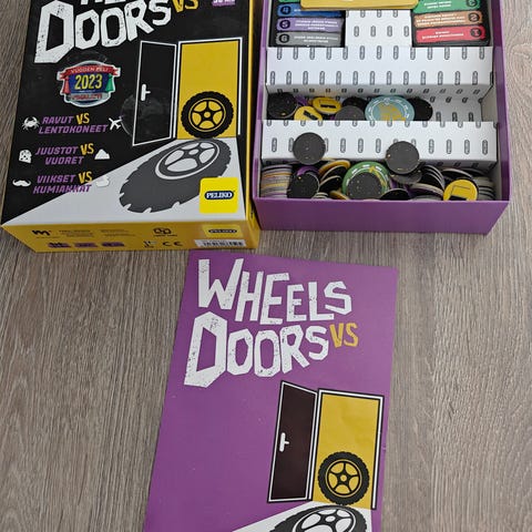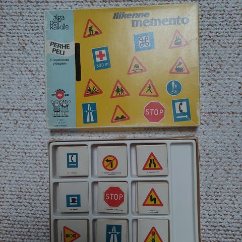 Opetellaan liikennemerkkejä peli. Pelialustalle kerätään oikeita liikennemerkkejä, sitä mukaa merkin nostaja sanoo merkin nimen. Hyvä kuntoinen. Yksi varoituskolmio merkki puuttuu ja jossain korteissa vähän taipumaa.