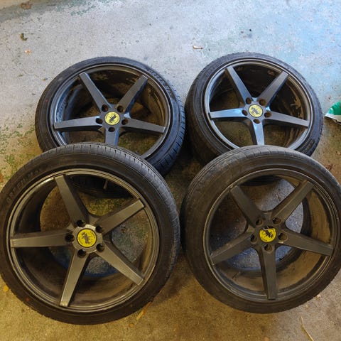 Yksi vanne ottanut osumaa. Näkyy kuvassa yksi. Ilmat pysyy ja ajamaan pystyy normaalisti. Renkaat kuluneet tasaisesti. Et 38. Paikallaan 57,1mm sovitteet. Keskimerkkejä ei ole.